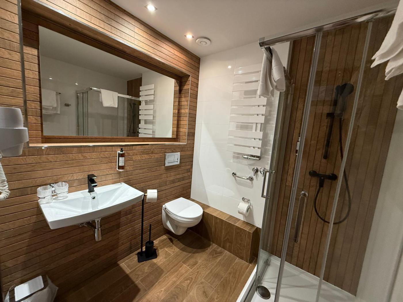 Pokój Dwuosobowy typu Superior. Offering free toiletries and bathrobes, this double room includes a private bathroom with a shower and a hairdryer. This double room features a tea and coffee maker, a wardrobe, a flat-screen TV and a balcony. The unit offers 1 bed. Powierzchnia pokoju ok.: 20 mkw. ;